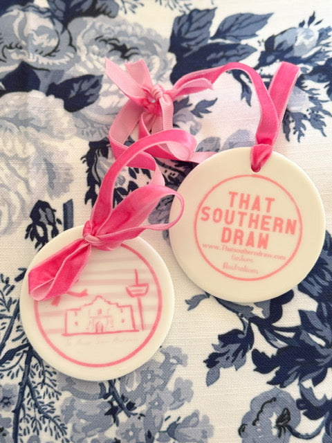 A round ceramic ornament featuring The Alamo & Tower of the Americas, San Antonio, TX on the front, paired with the That Southern Draw logo on the back, finished with a pink velvet ribbon for hanging.