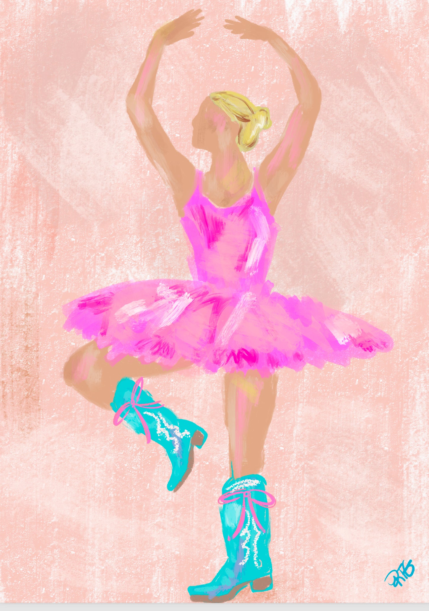 Fun and vibrant illustration of a ballerina in a pink tutu and turquoise cowboy boots, blending elegance with playful Texas flair.