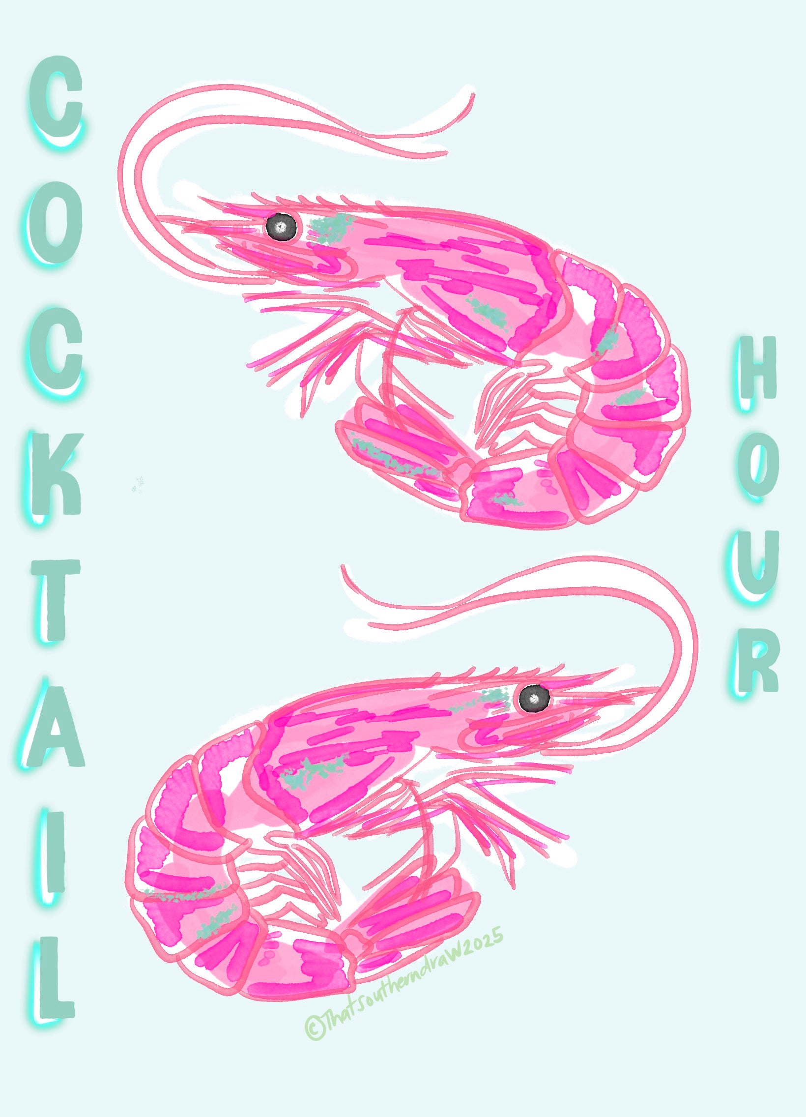 Bright and playful “Cocktail Hour” illustration featuring bold pink shrimp, perfect for coastal décor and seafood lovers.