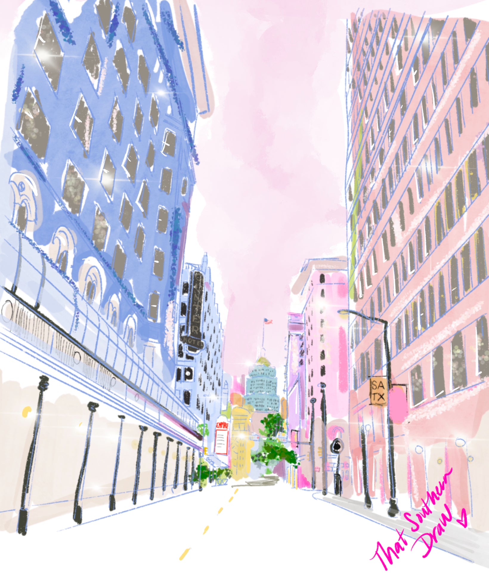 Bright pastel tones capture the heart of downtown San Antonio, with iconic architecture and a dreamy pink sky that brings the city to life. A vibrant statement piece for any Texas lover.