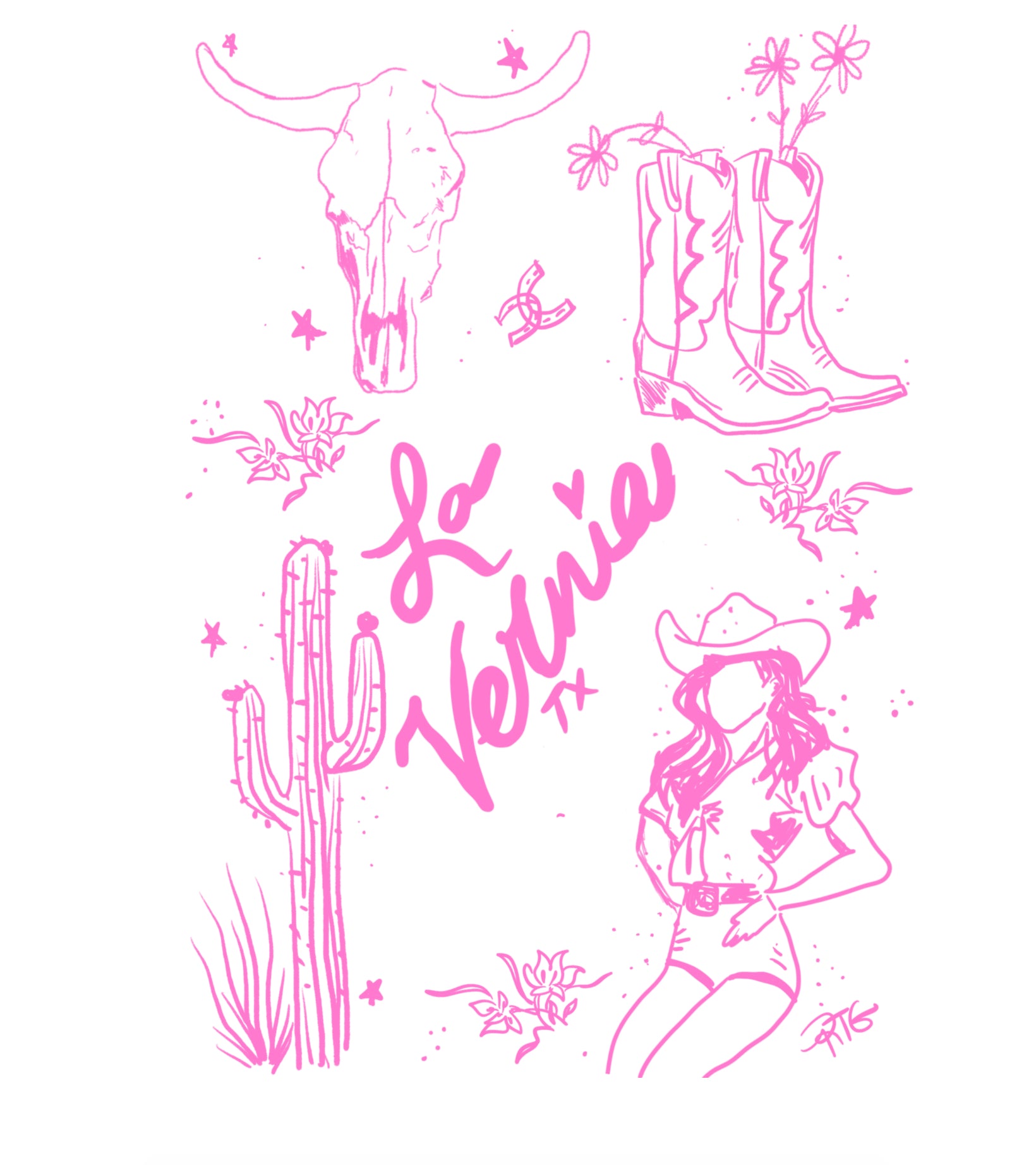 A fun print highlighting La Vernia, Texas with a cowgirl, cactus, flowers and horseshoes. Printed in my favorite hot pink to make it more fun! Great gift when you want to welcome someone to the town or your a local. Print is included on stickers and tee shirts. All sizes are able to be framed as well.