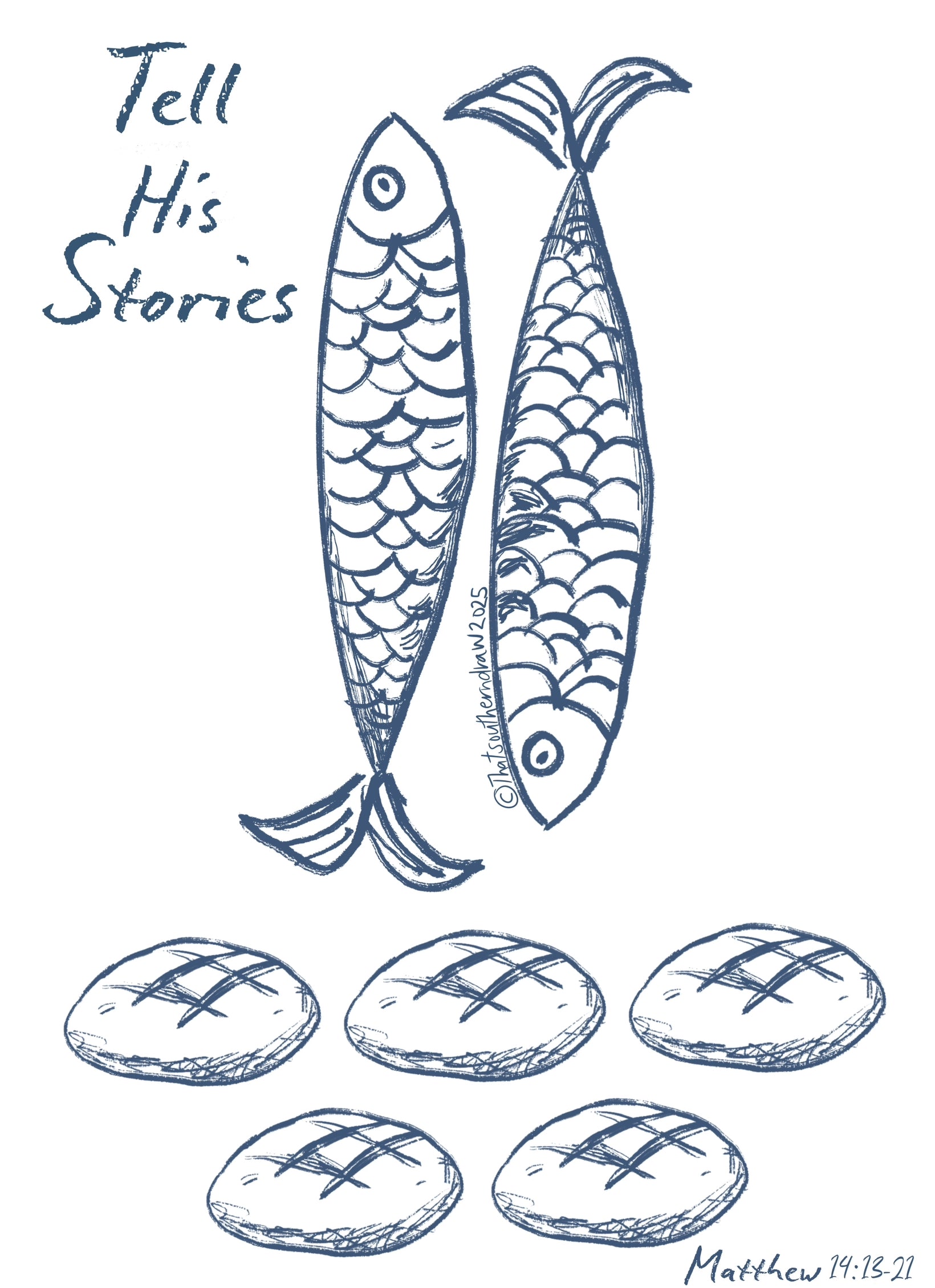 Inspirational hand-drawn illustration of the loaves and fishes with “Tell His Stories” text, inspired by Matthew 14:13-21.